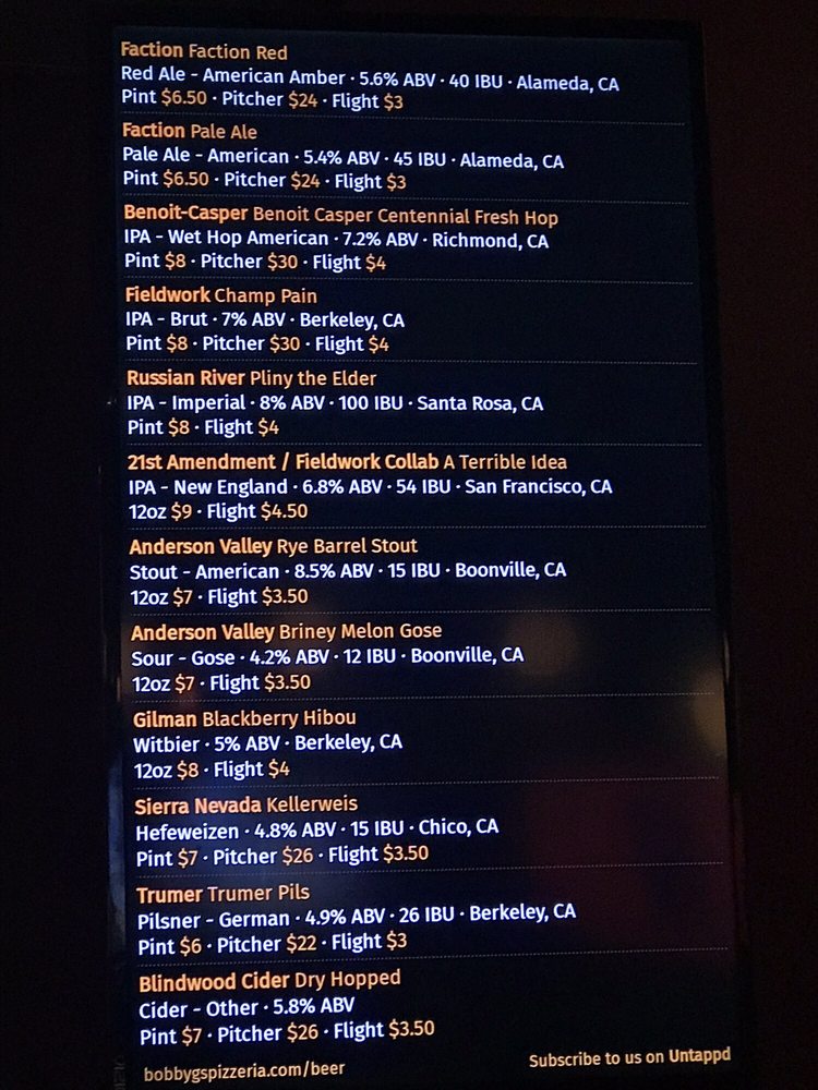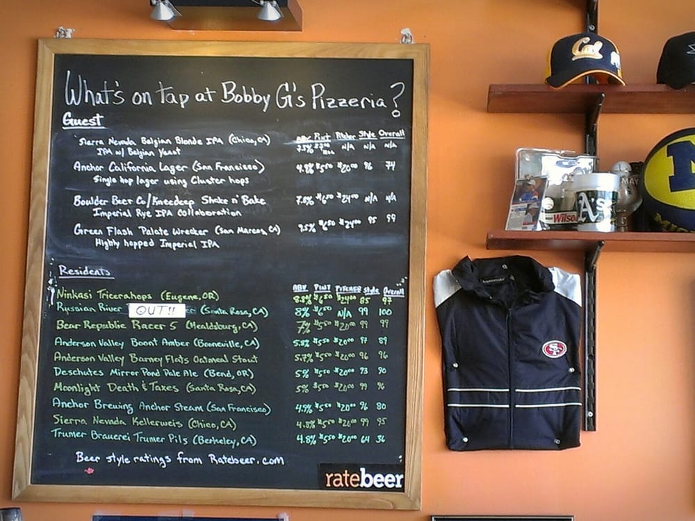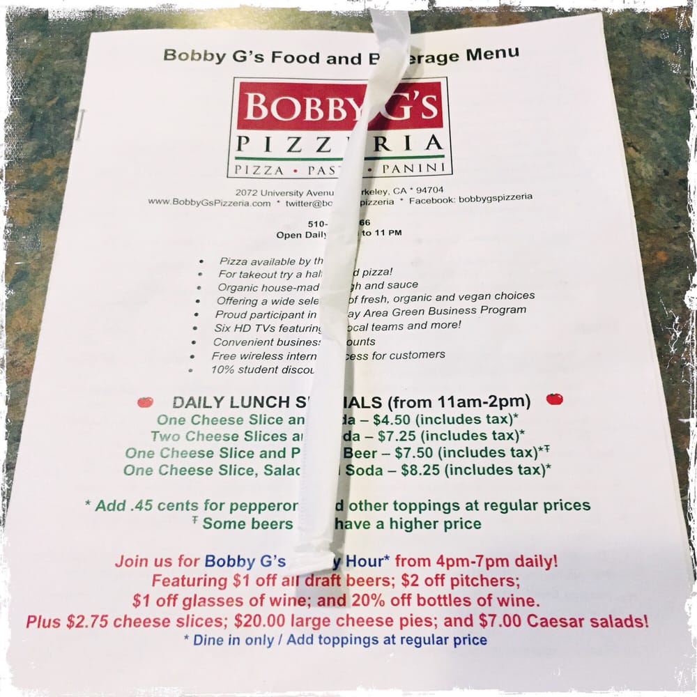 Introducing the menu at Bobby G’s Pizzeria, located in Berkeley, CA, a casual spot that offers a variety of unique pizzas and beverages. The menu features Bobby G's Pan Fried Pizzas, including the Fried Margherita Pizza and Fried Mushrooms and Goat Cheese Pie. Signature Red Pies like the Arugula and Cheese Pizza and Buffalo Chicken Pie are also popular choices. Customers rave about the laid-back atmosphere, friendly staff, and great food and beverages. Bobby G’s is known for its crispy wings, tasty pizzas, and thoughtful beer selection. With options like Vegan and Vegetarian dishes, covered outdoor seating, and live music on select nights, Bobby G's Pizzeria provides a welcoming and enjoyable dining experience. Visit for a relaxed vibe, quality food, and a great place to watch a game with friends.